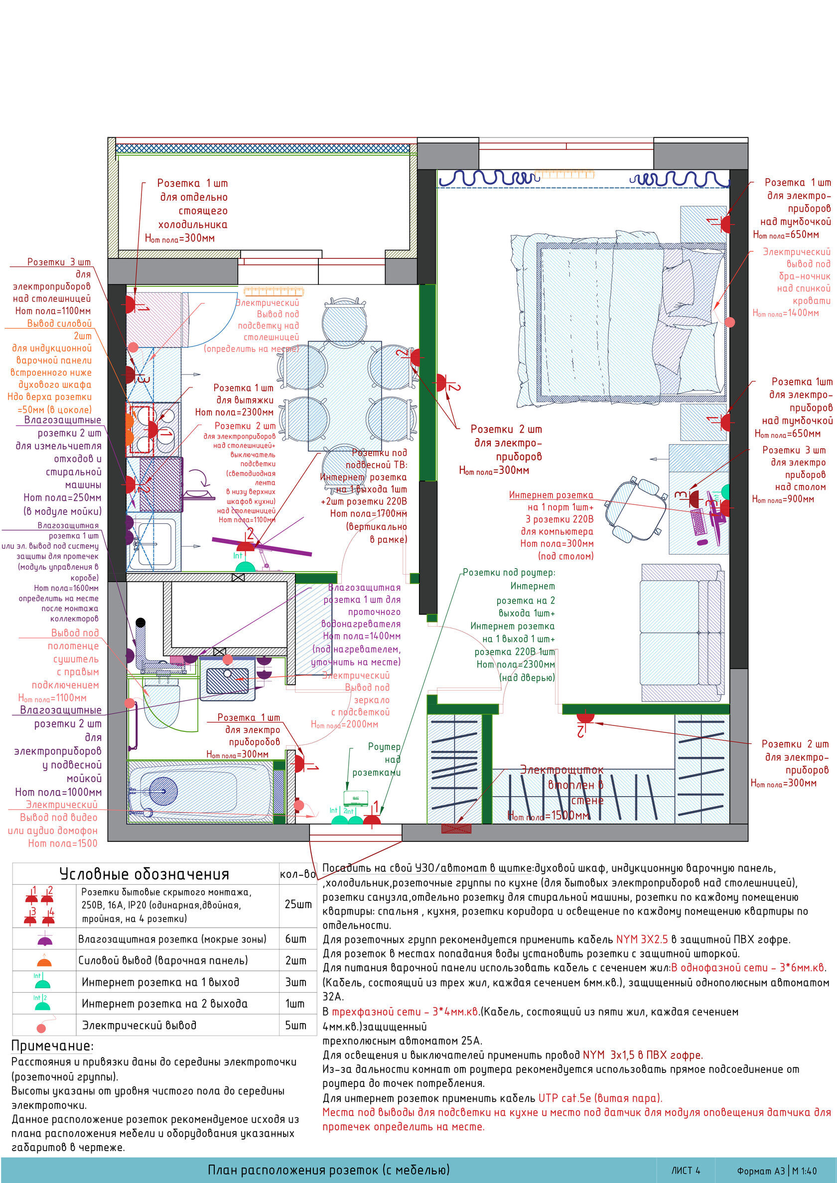 В пакет “Минимальный” входит планировочное решение — это 2D-план квартиры (рабочая документация – чертеж) с отображением перегородок / мебели / электрики / сантехники и другими необходимыми комментариями для выполнения ремонта вашей квартиры